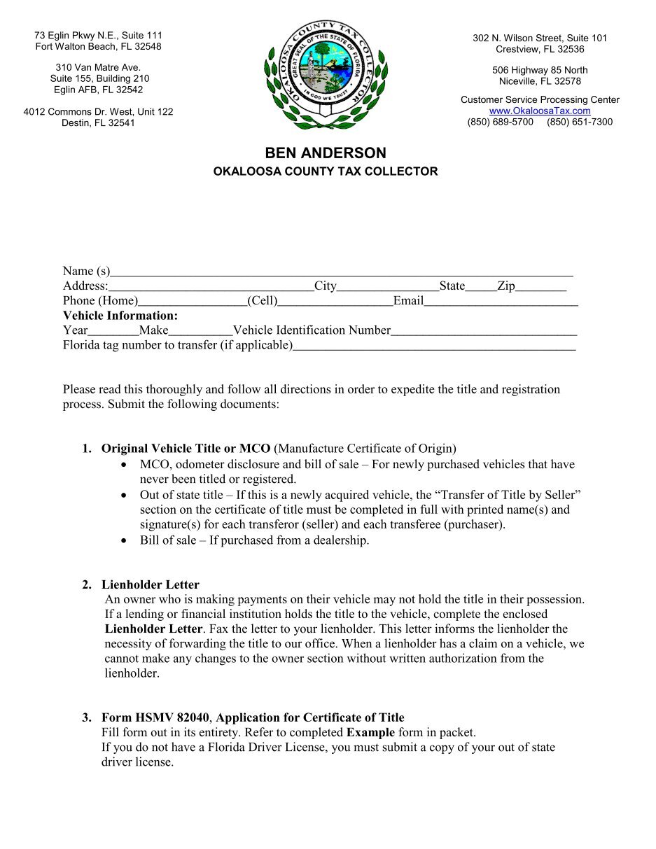 Web Okaloosa County Tax Collector. Building 90320 Suite 111 Hurlburt AFB FL 32544 651.